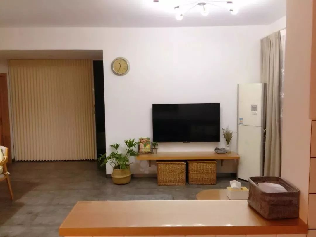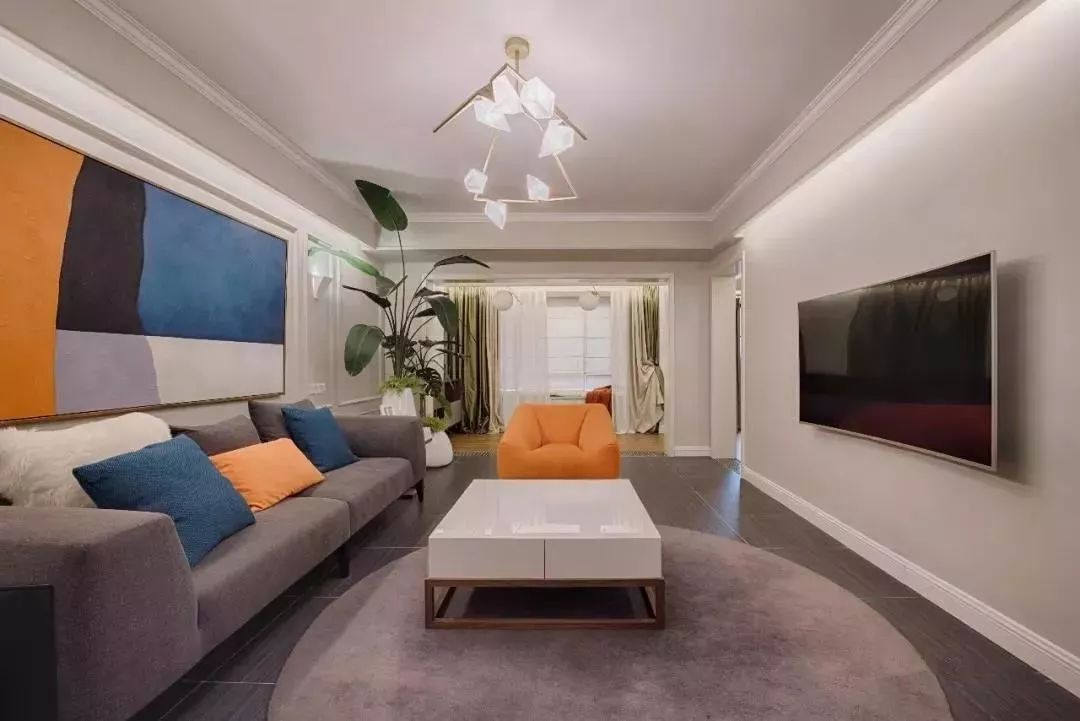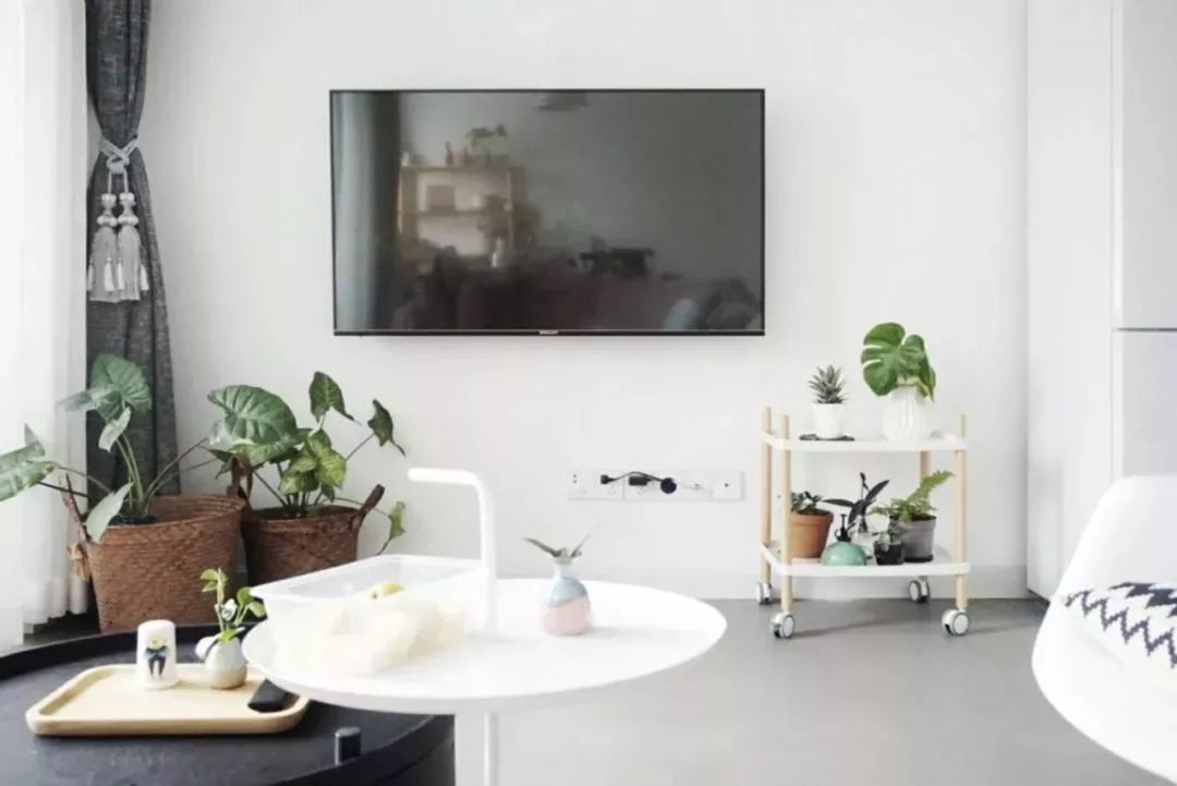 直接在电视背景墙上摆放一个壁挂电视,四周刷上自己喜欢的乳胶漆,舍去了电视柜之后,客厅的布局也更不会那么紧凑。