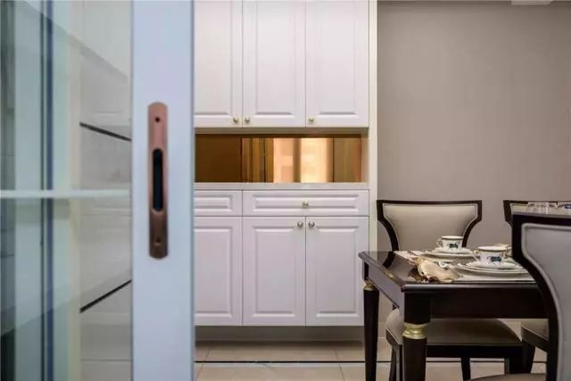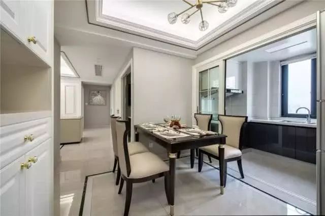 然后就是餐厅,黑色餐桌也是很大气的,而米黄色餐椅也是看着就有档次的~而餐厅与厨房之间用白色推拉门来隔断也是很时尚的一种选择~