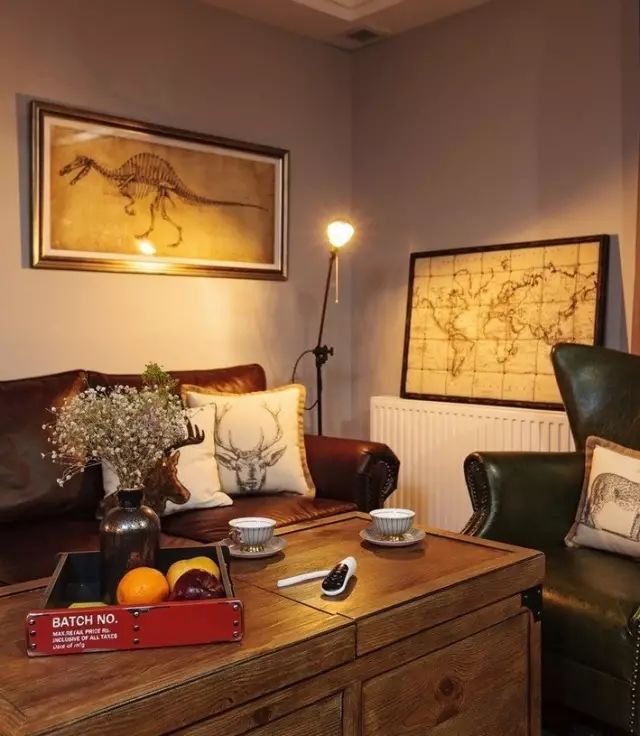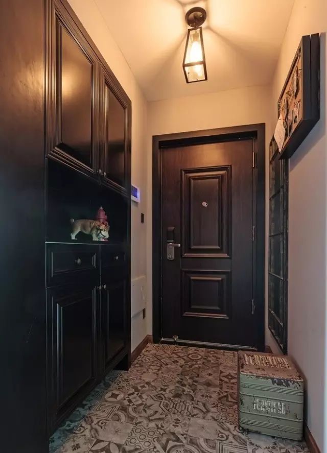 ▲暖色调灯光渲染了温馨氛围,踏入家门的第一步就感受到浓浓的爱。做旧的锈迹铁箱是一个换鞋凳,既有装饰效果,还具有一定的便利性。