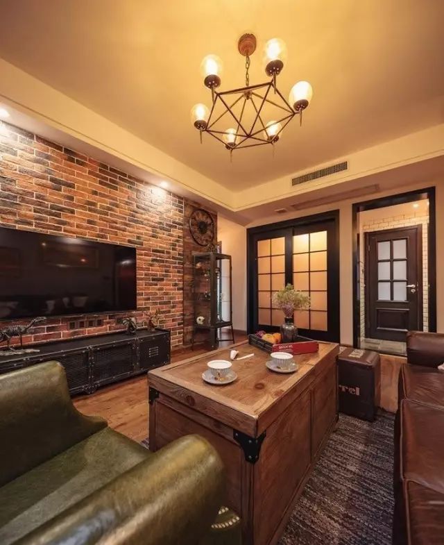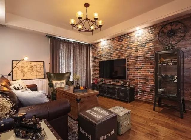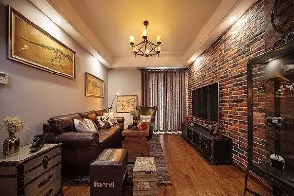 ▲电视背景墙大面积采用红色砖墙纸,体现了质朴的工业风特点。