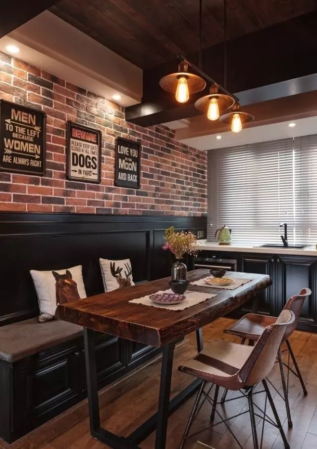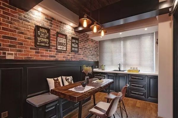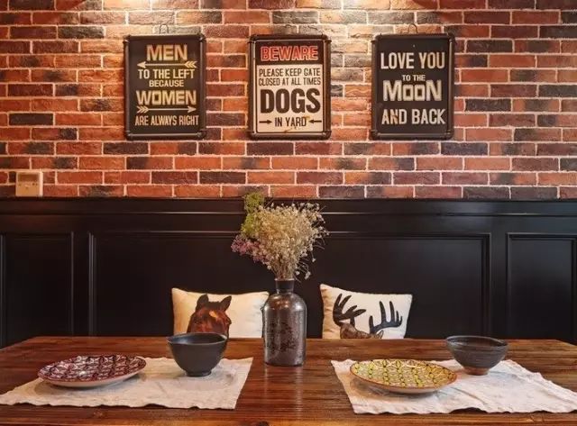 ▲生态木吊顶、红砖、谷仓门、工业灯,看似毫无关系的物件拼凑而成一个具有怀旧复古味道的用餐空间。