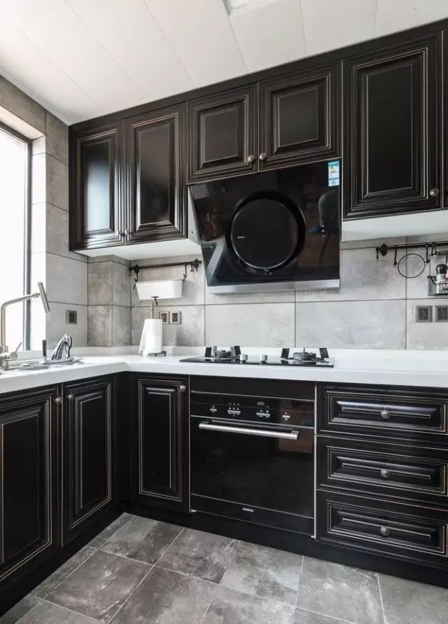 ▲厨房地面采用了水泥色,橱柜线条感明显,颜色表面比较透亮,富有光泽的黑色让厨房不会显得那么沉闷。