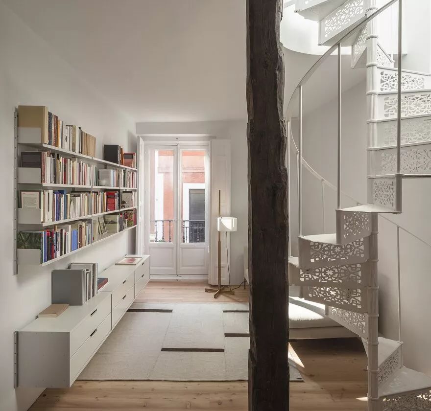 在马德里市中心区的Malasaña,Francesc Rife 的设计师设计了一处亲密而温馨的小公寓,公寓的屋主从一开始就寻求成为西班牙首都喧嚣地带的一处世外桃源。针对空间的独特特性,将其分为两层,新设计采用旧的锻铁螺旋楼梯来连通布局。