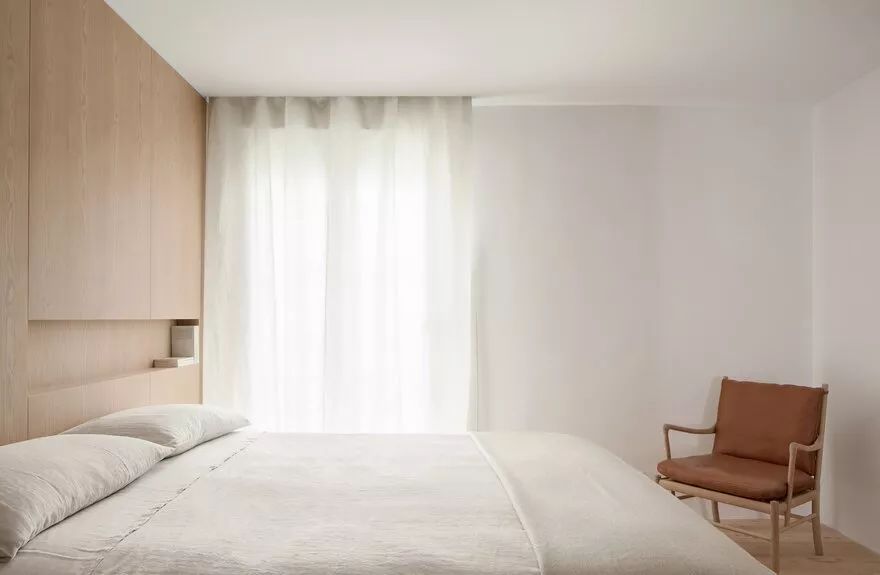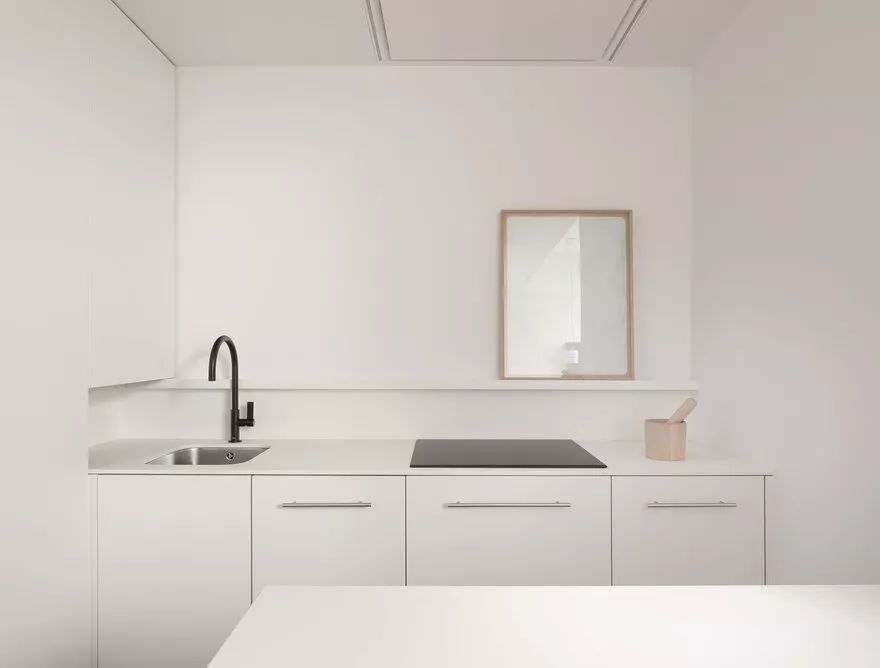 厨房以相同的浅色调布置,通向几乎未被注意到的其余空间,起到过渡性家具的作用,没有噪音。所有集成式家具和电器让空间利用率提升。餐厅面向厨房,定制设计的桌子和长凳,采用相同的松木材料。客厅的其他部分配有B&B Italia沙发和Vitsoe书柜。面向街道的百叶窗过滤自然光,投射到楼梯间。装饰照明也用于在某些区域实现更大的照明。