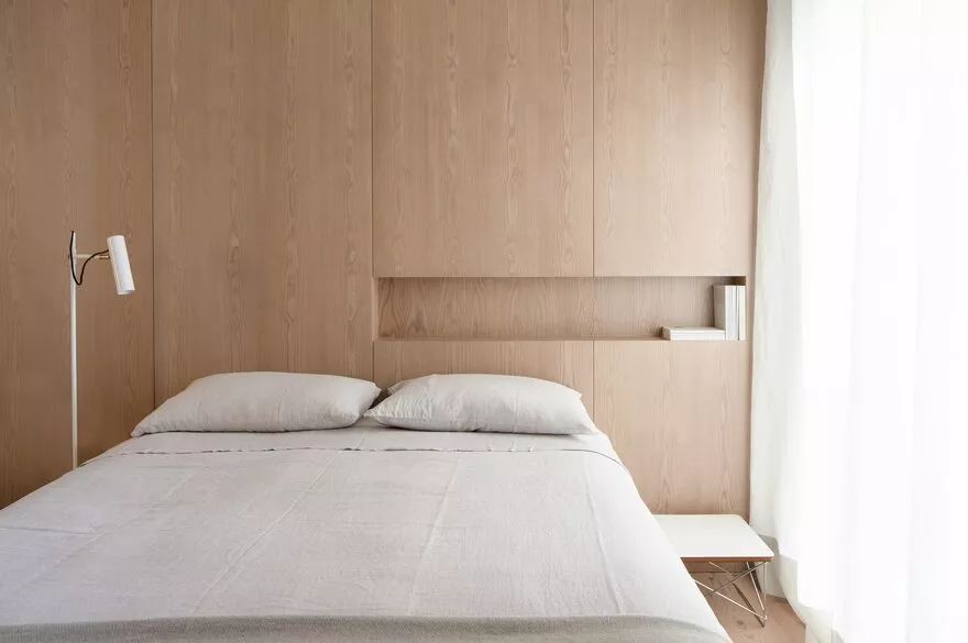 公寓的尽头是一间由推拉门隔开的卧室。这使得可以将其与住宅的其余部分完全连接,同时这里隐藏着书柜。大型床头板将松木语言延伸至浴室,白色白云石大理石覆盖。材质的微妙姿态,为房子的这个空间增添价值。最后,楼梯通向连着露台的工作室,这里可以看到马德里的屋顶和天空。通过引入墙面植被,营造出田园的风格。
