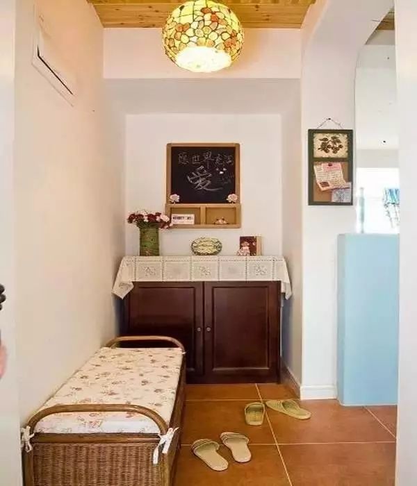 玄关有个独立小空间,复古地砖上放着藤艺小碎花换鞋椅,玄关柜上的小黑板让这个家也充满了爱,就喜欢这温馨的感觉~
