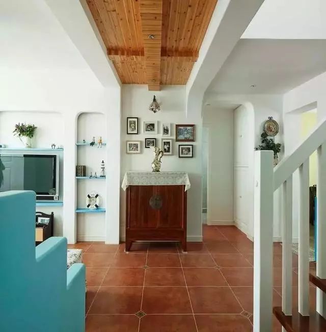 面积:122㎡(套内面积,建筑面积137㎡)风格:地中海田园混搭户型:复式(3室3厅2卫)玄关有个独立小空间,复古地砖上放着藤艺小碎花换鞋椅,玄关柜上的小黑板让这个家也充满了爱,就喜欢这温馨的感觉~往左进入客厅前有个阶梯式的可爱隔断,与复式楼梯的元素互相呼应;在两个过度空间的立面以墙面照片墙以及矮