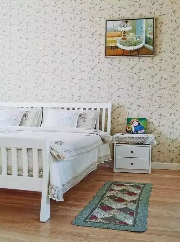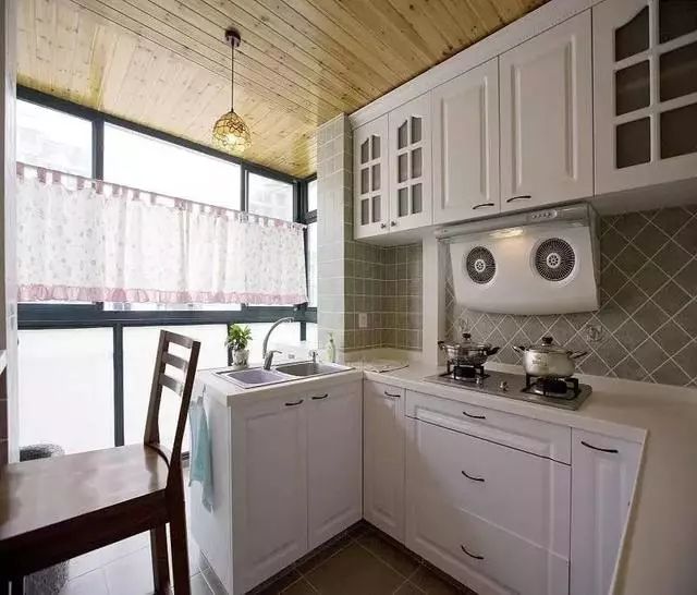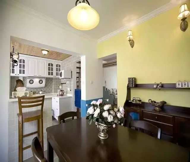 沿着布局的动线往餐厅走,跳色到鹅黄色的空间,神木色的餐桌椅显现休闲质感;餐厅与厨房之间以砖墙样式的吧台隔断,这是夫妻俩喜欢的其中一个设计点;厨房墙砖统一,为了丰富装饰效果,以菱形和竖排方格打造清新氛围。P.S.不想要厚重的窗帘,这种半遮挡的小碎花帘布就是不错的选择!