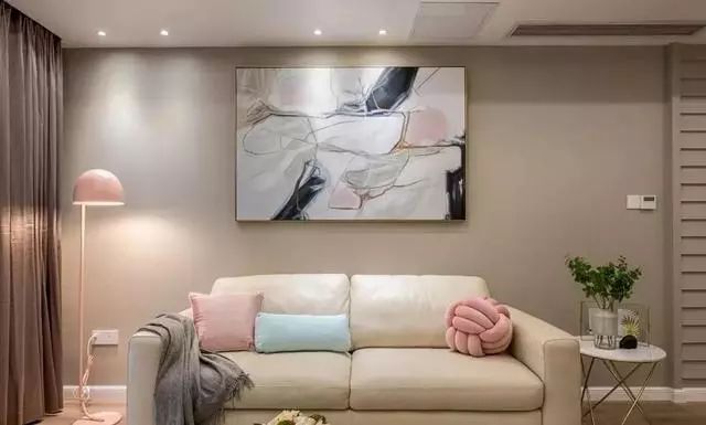 沙发背景墙这里,有一个创意的抽象壁画装饰,看起来也是不错的。沙发使用布艺沙发,很舒适。