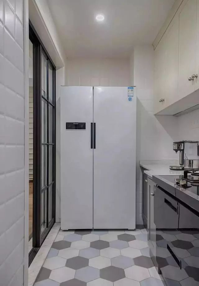 厨房地面的瓷砖是六边形的瓷砖拼接设计,整体看起来十分的美观。