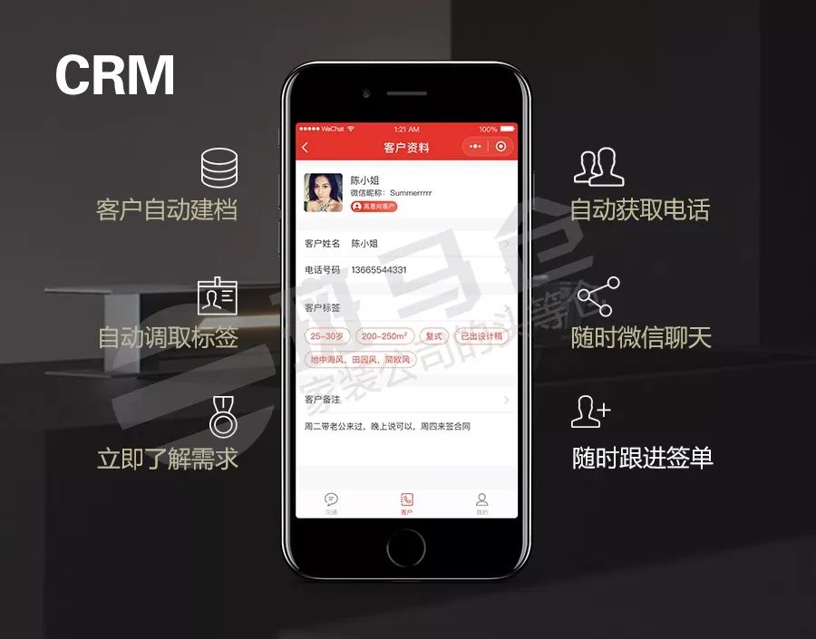 自动建档客户信息,自动调取用户标签、直观了解用户需求,无需添加好友即能随时和用户无障碍沟通,实时跟进用户状态,提高签单率。