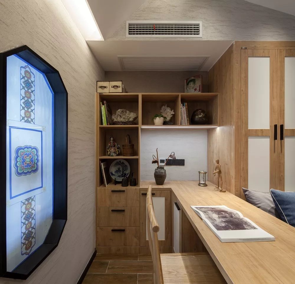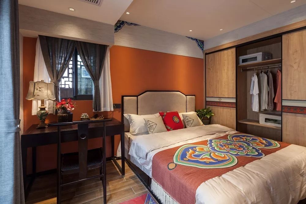 设计师从綵衣堂的彩绘获取灵感,床铺的软装以及衣柜柜门上,都运用了綵衣堂包袱锦彩绘元素进行装点,将传统艺术与现代生活完美融合,在新颖别致的同时又不失高雅大气。房间的功能性也非常完备,床铺、写字桌、大衣柜,被合理地放置在这间卧室里,动线更加合理,使用起来也更加方便。