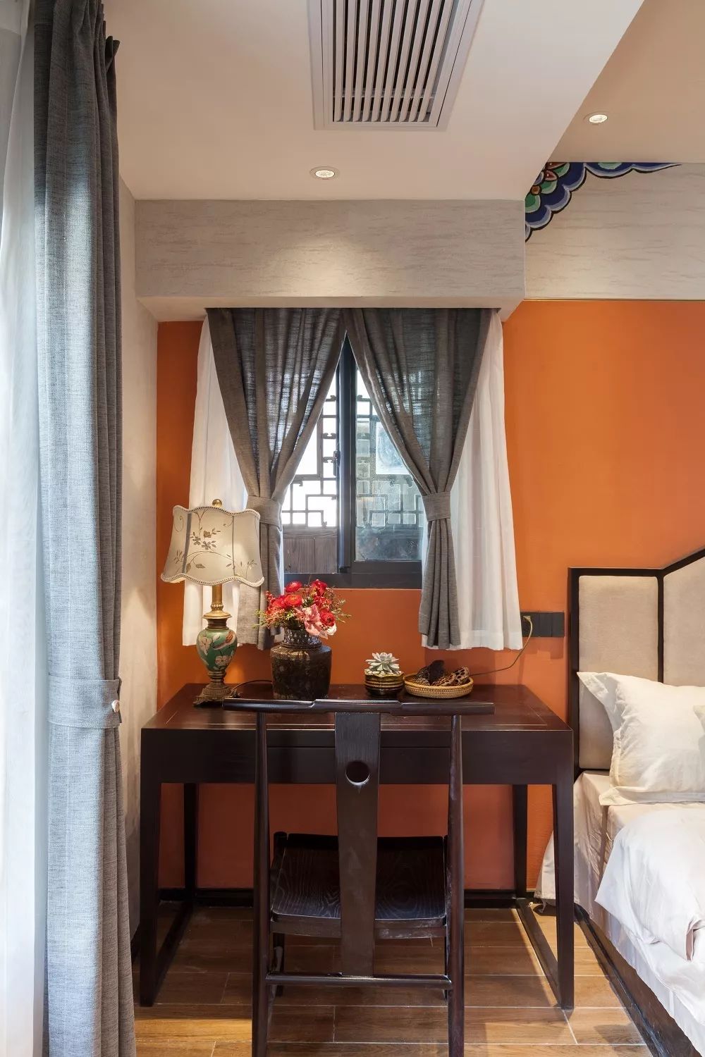门厅向北是新家的卧室。改造后,设计师大胆地使用暖色,用暗橙色和木色作为卧室的主基调,色彩活跃,却十分和谐,营造出温馨舒适的氛围。房间内的窗户,大大保证了足够的通风和采光。