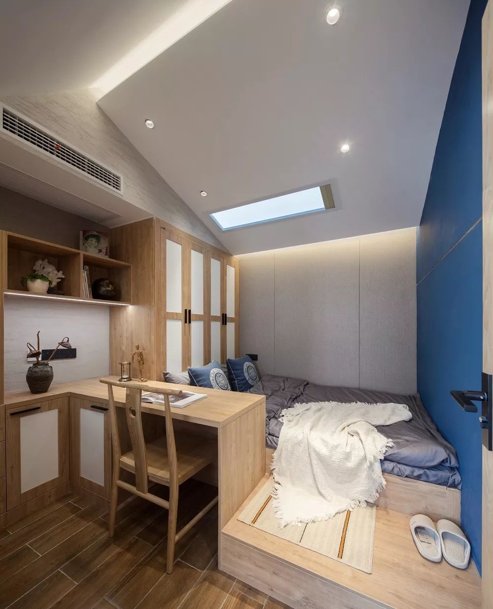 设计师在卧室顶部新开了一扇天窗,保证了卧室中能有足够的自然采光。儿子卧室拥有独立的办公学习区域,同时还配备了六个储物格、四个抽屉以及两个大衣柜,用来摆放书籍或者衣物,绰绰有余。