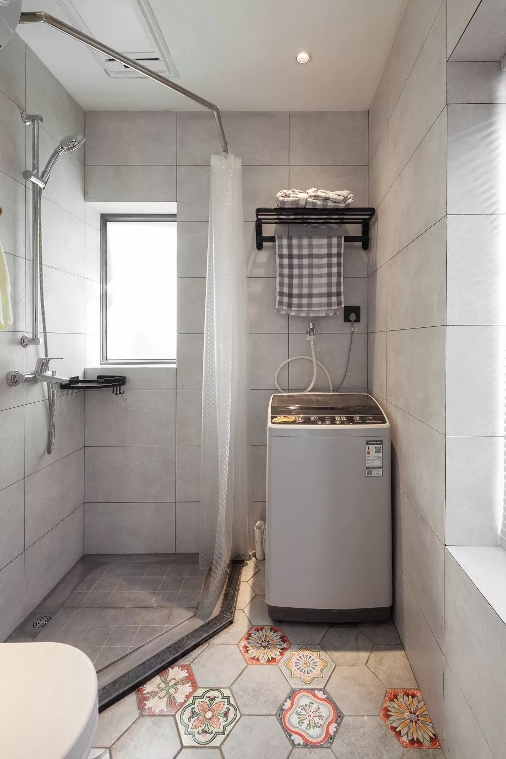 改造后新增的卫生间位于儿子房的西侧,洗衣、沐浴、如厕,都可以在这里完成,彻底解决了老两口的一大难题。带有鲜花图案的地砖,搭配灰色的墙面,让整个卫生间看起来格外干净整洁。