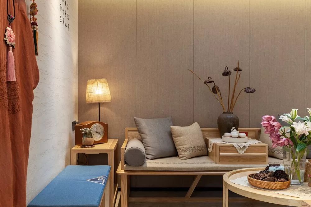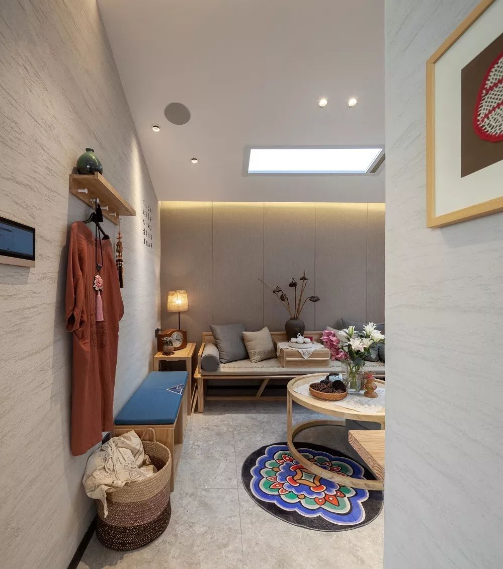 地面上一块圆形包袱锦彩绘地毯,成为了整个空间的点睛之笔。设计师特意增加了这一抹跳色元素,让空间顿时灵动了起来。