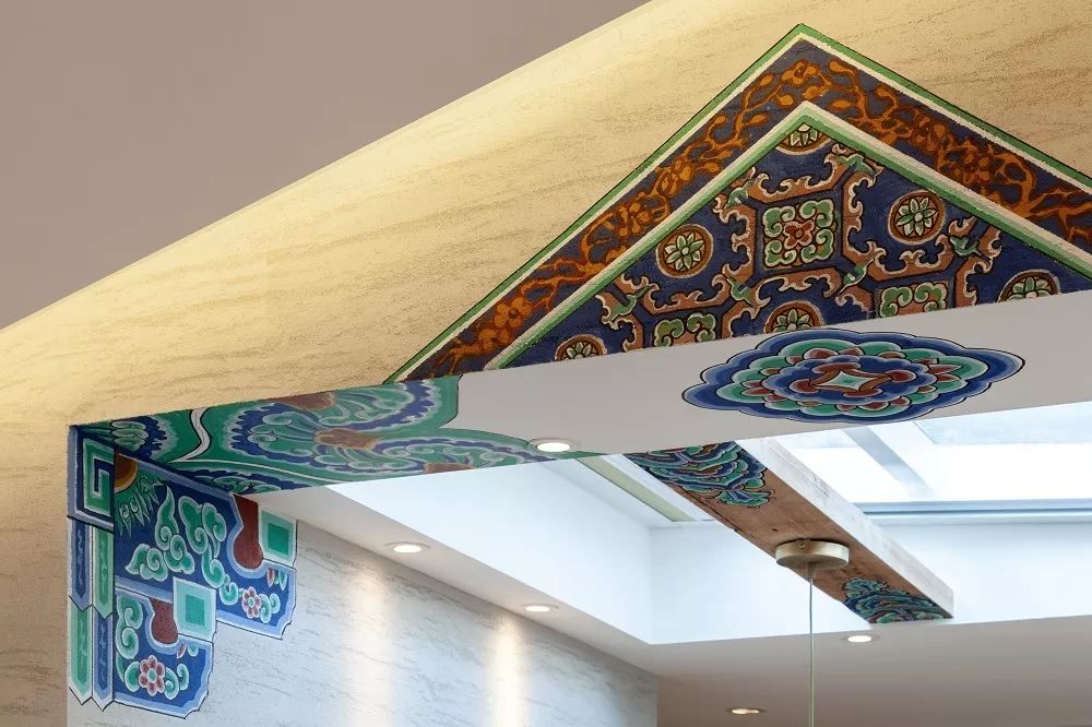 设计师由伟壮将綵衣堂独有的江南包袱锦彩绘艺术融入设计,并赶在收房之前,耗时两天,一笔一笔的把彩绘画在了客厅与餐厅之间的墙面上。不仅视觉上让空间更加层次丰富,也使得房屋的地域文化气息更加浓厚。