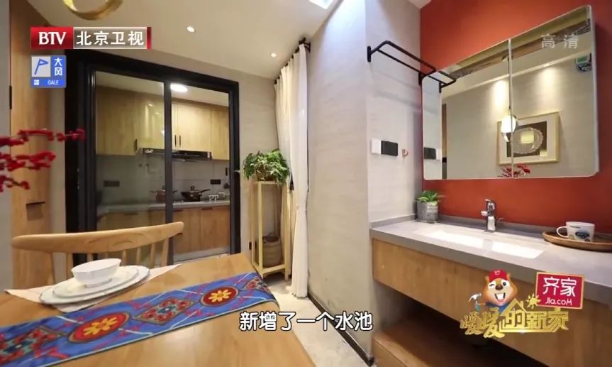 设计师在餐桌对面还新增了一个水池,从今往后,业主一家人就可以在屋内刷牙洗脸了,同时这样的设计,也实现了卫生间的干湿分离。