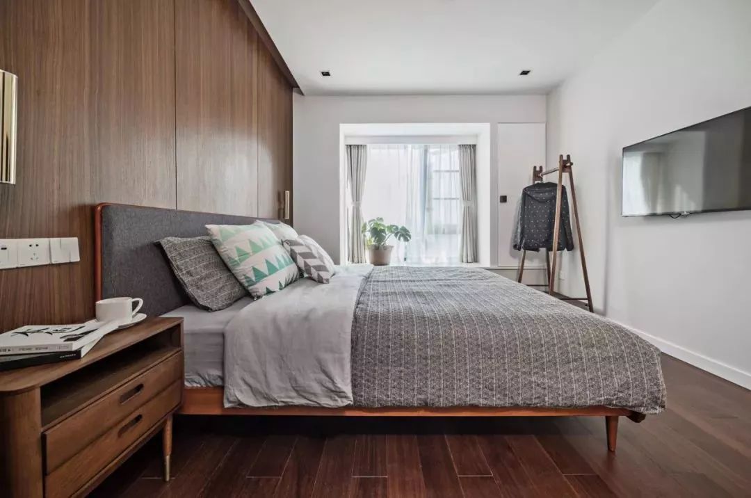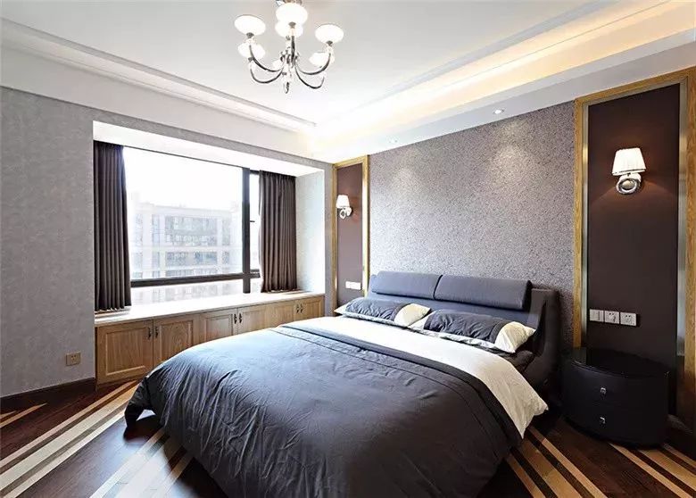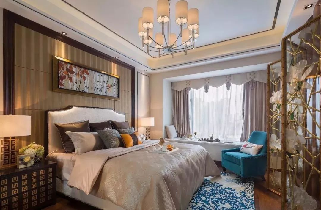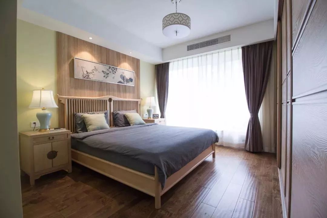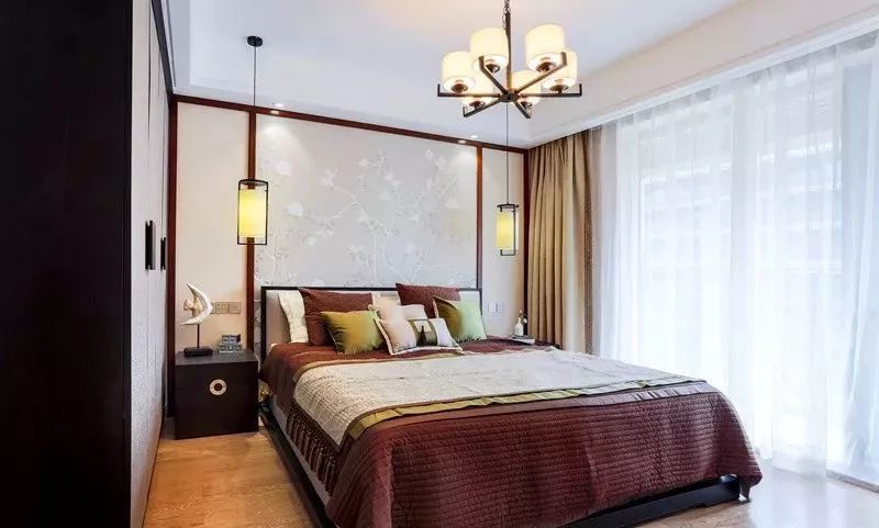 中式风格的卧室窗帘。则以米黄、灰色、黑色等跟整体卧室风格搭配的色调为主。