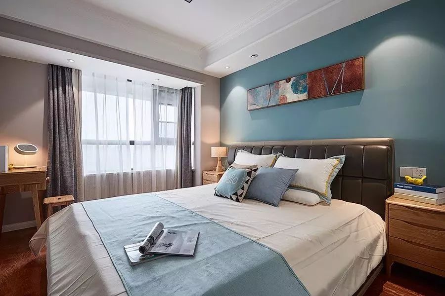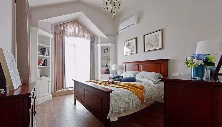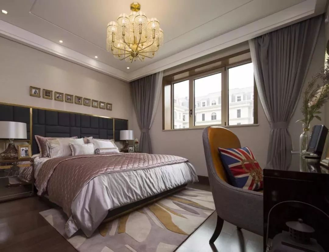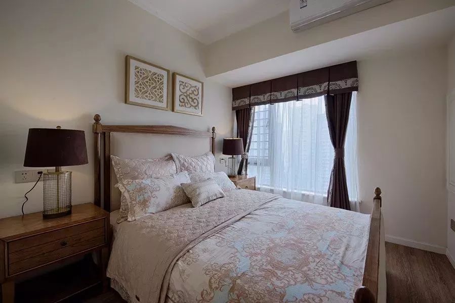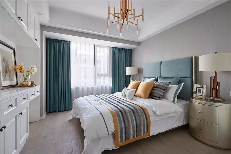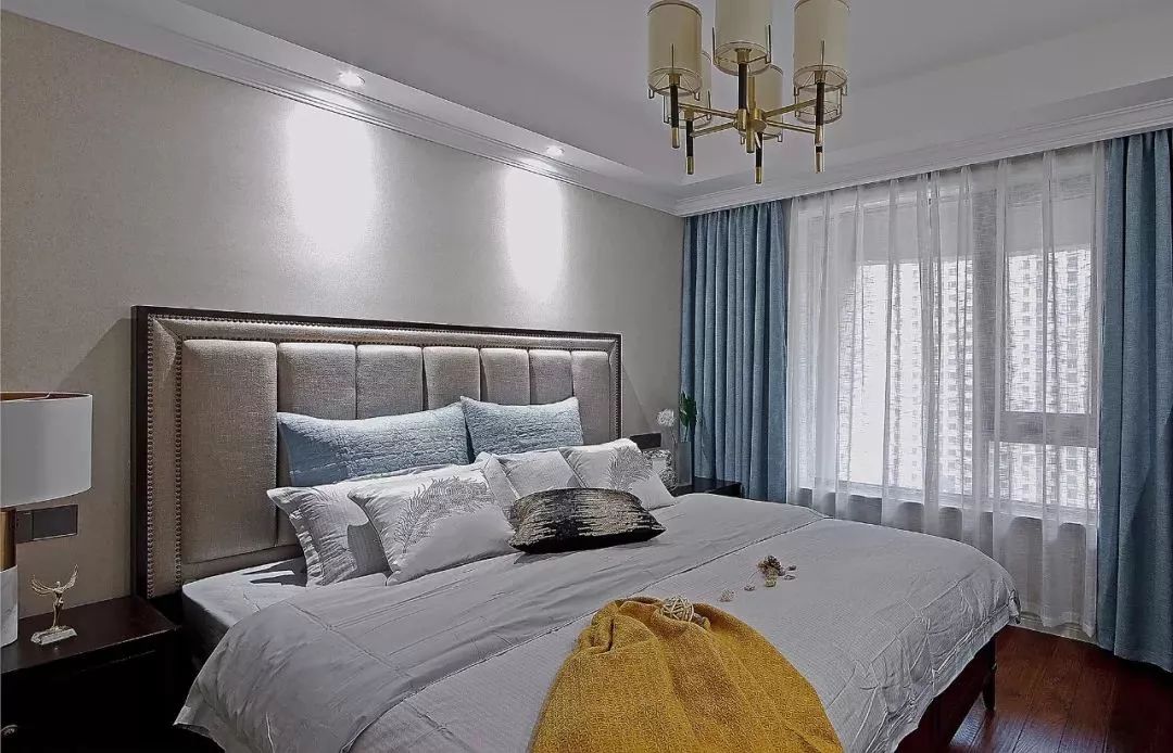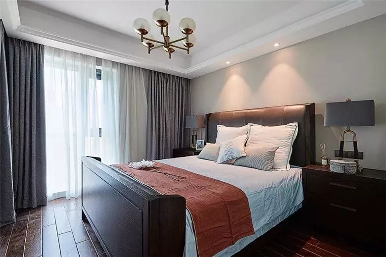 美式一般是现代美式风格,这种风格的卧室窗帘搭配,也是以素色为主,整体比较优雅精致。