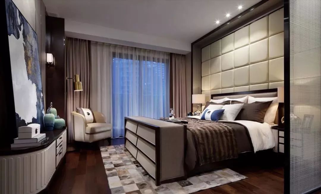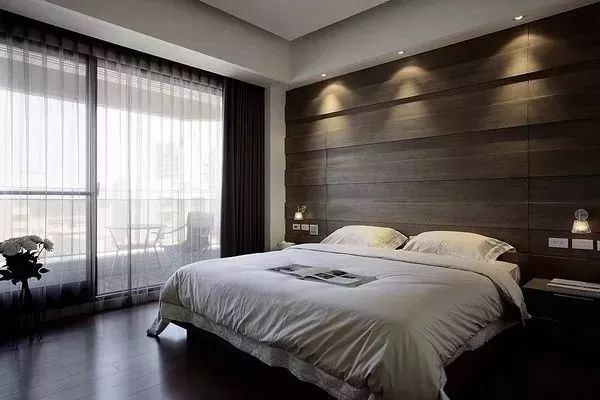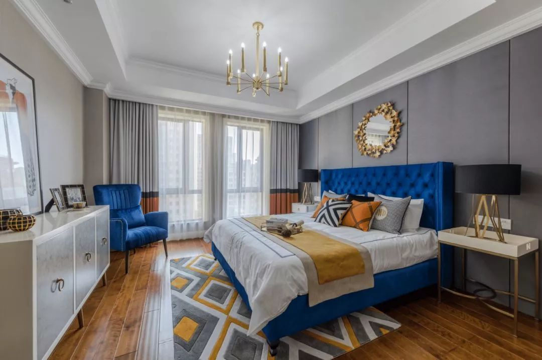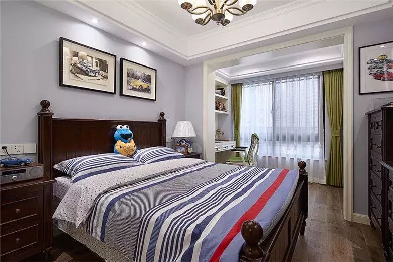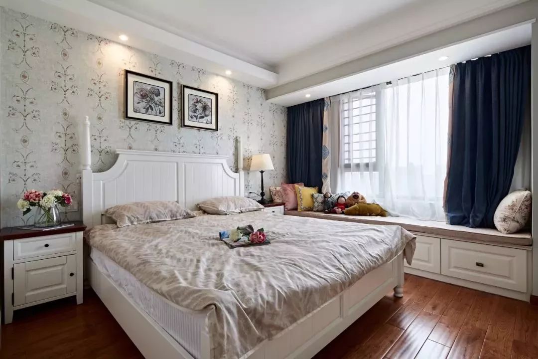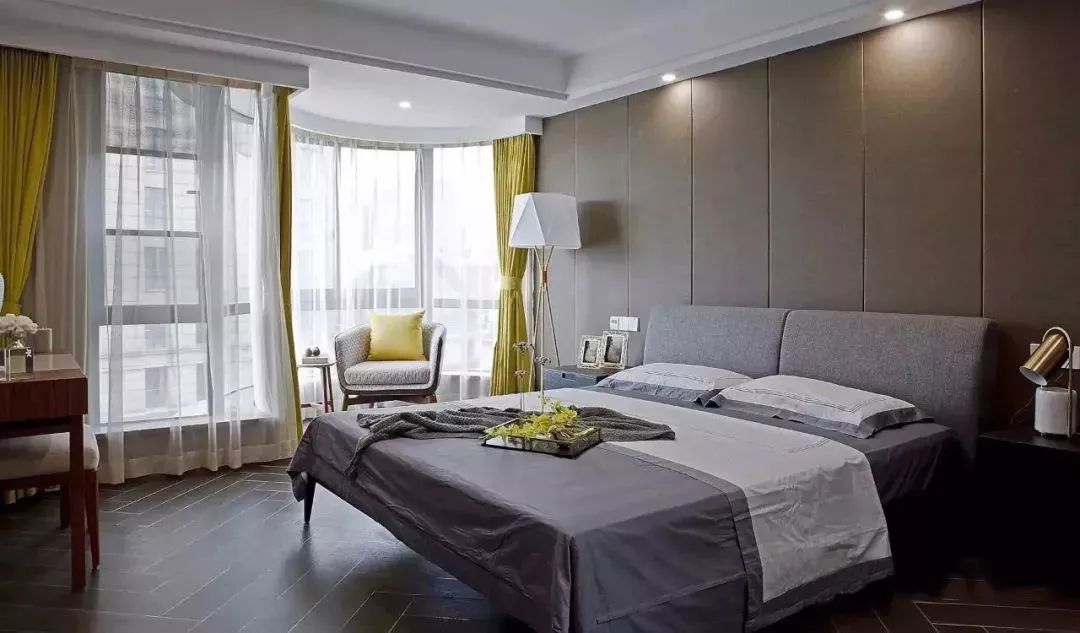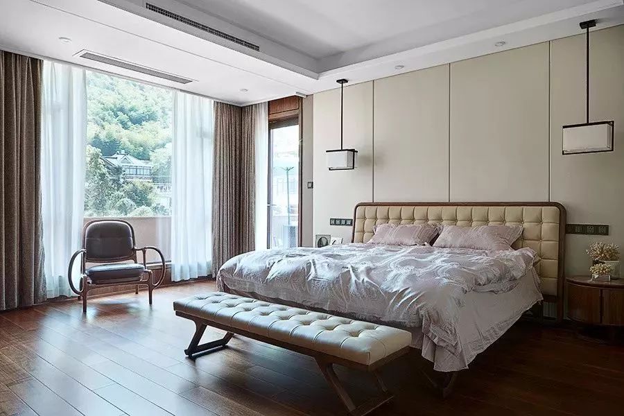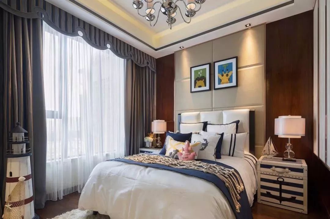 美式一般是现代美式风格,这种风格的卧室窗帘搭配,也是以素色为主,整体比较优雅精致。