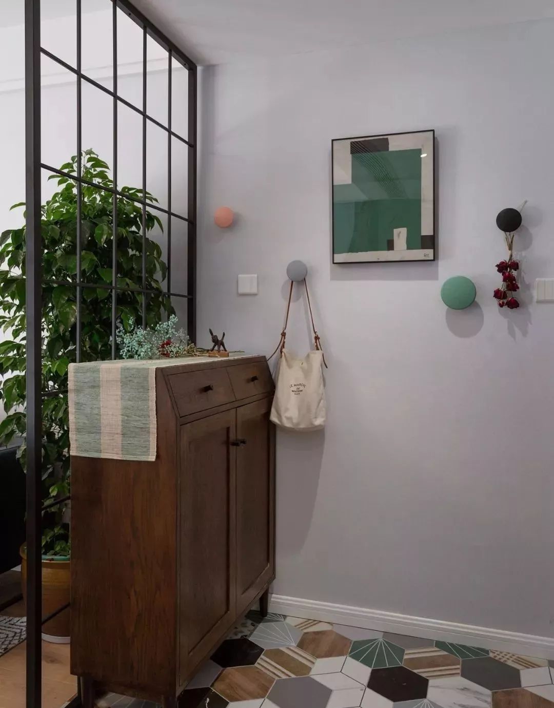 入户玄关处,采用六角花砖和地板的错位铺设,视觉上划分出独立的玄关。