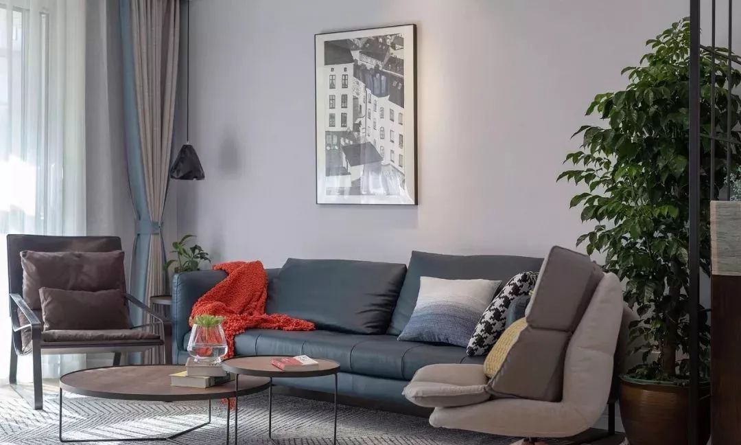 客厅通过简单的木质,皮质,布艺,绿植等,使得空间清而不乱,素而文雅。