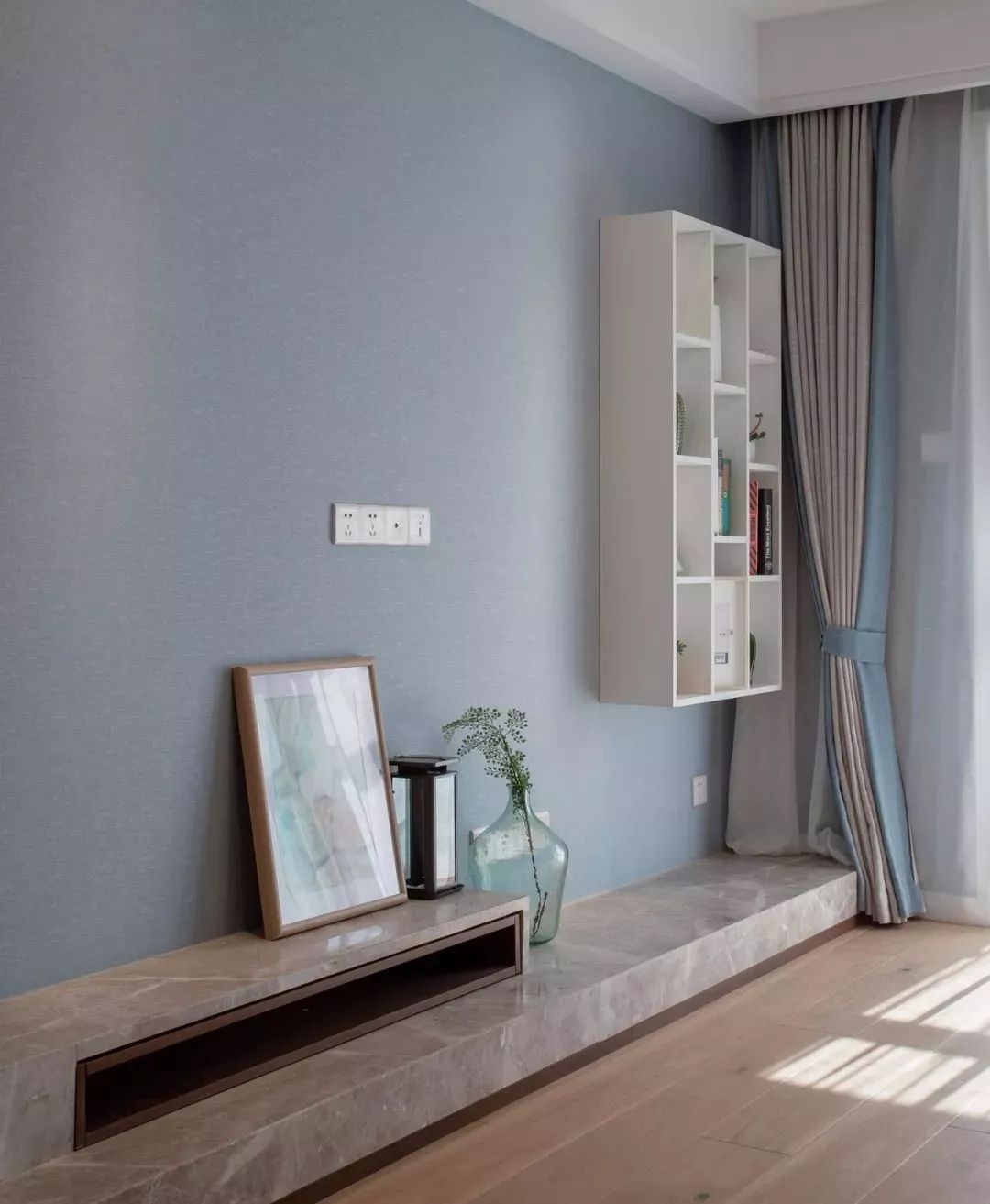 蓝灰色壁纸铺贴出素雅电视背景,靠一侧墙面安装悬空置物柜来平衡错落地台。