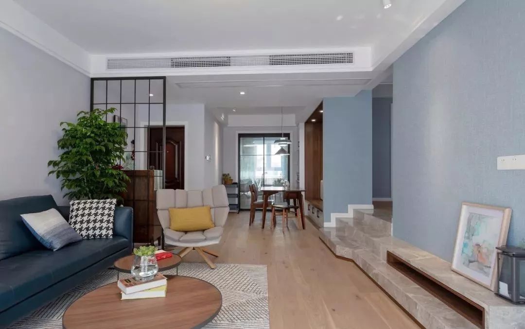 木纹茶几组搭配条纹地毯,为空间增添自然与舒适质感。