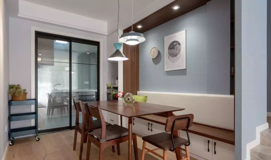 因为楼梯位置,使得餐厅比例短小,经过重新划分,餐厅使用具备收纳空间的卡座设计。