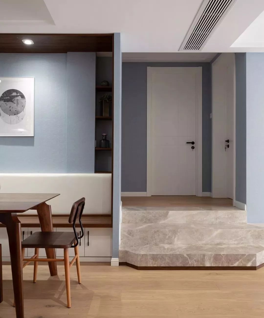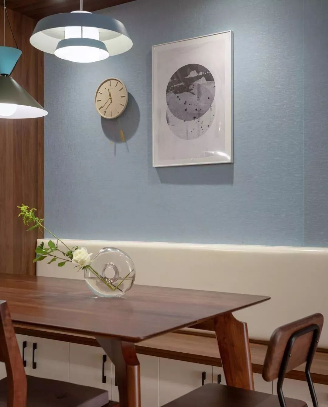 胡桃木板套边处理,灰蓝色墙布配合白色皮质靠包,餐区的整体氛围感得以聚拢。