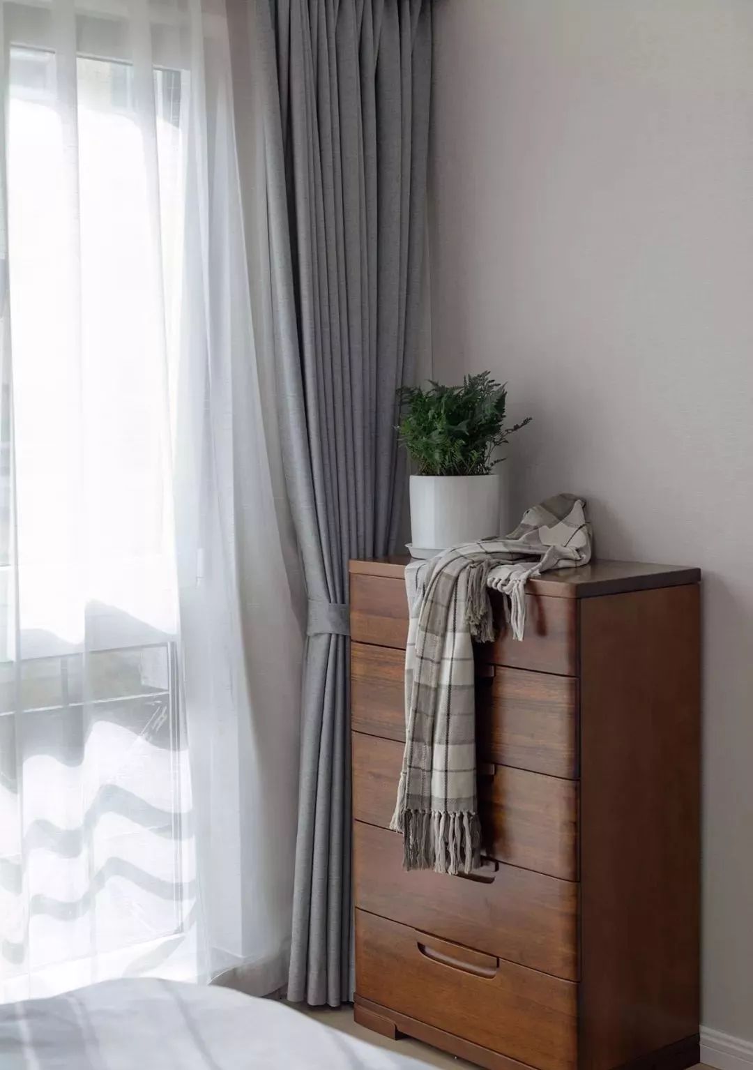床尾放一组实木多斗柜,可以收纳一些小物件,同时台面上可摆放绿植或者挂画来装饰空间。