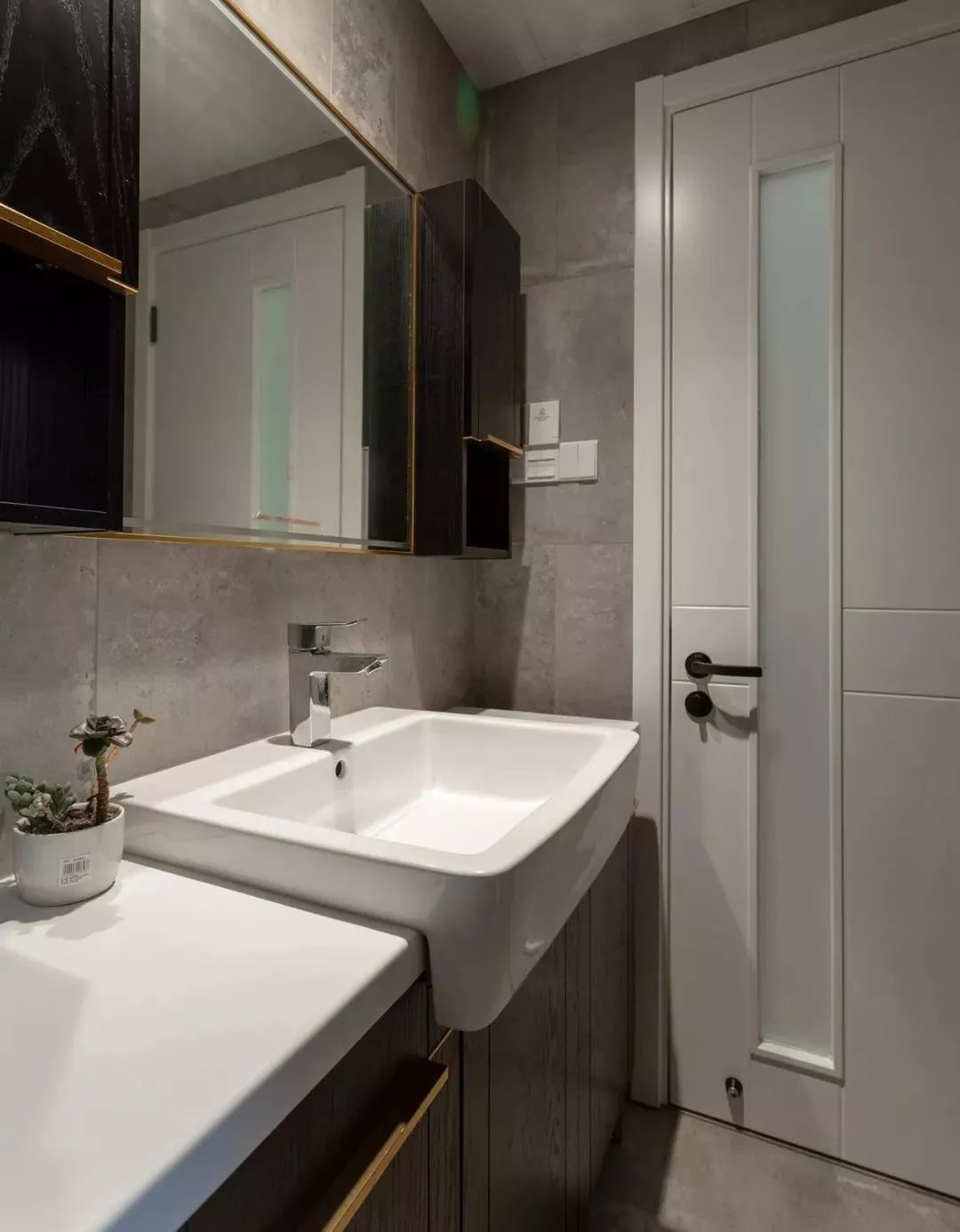 主卫整体通铺水泥砖,深木色台盆柜与镜柜采用金色线条勾勒。