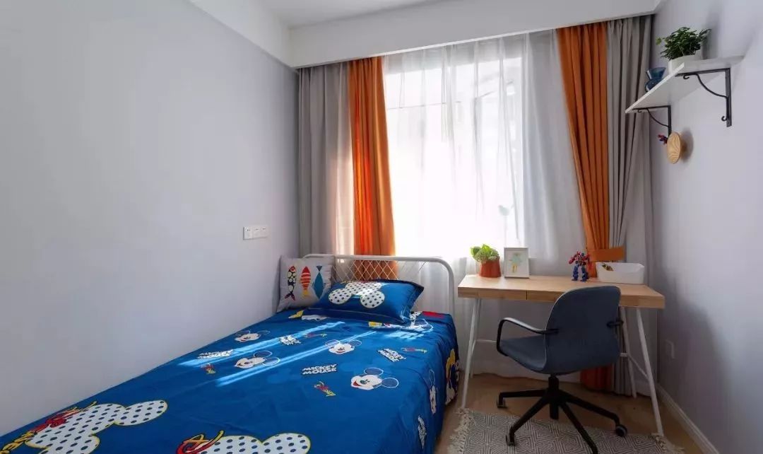 儿童房,以木地板搭配灰色壁面,橙灰色拼接窗帘提亮色调,单人床与写字台满足休憩学习的功能。