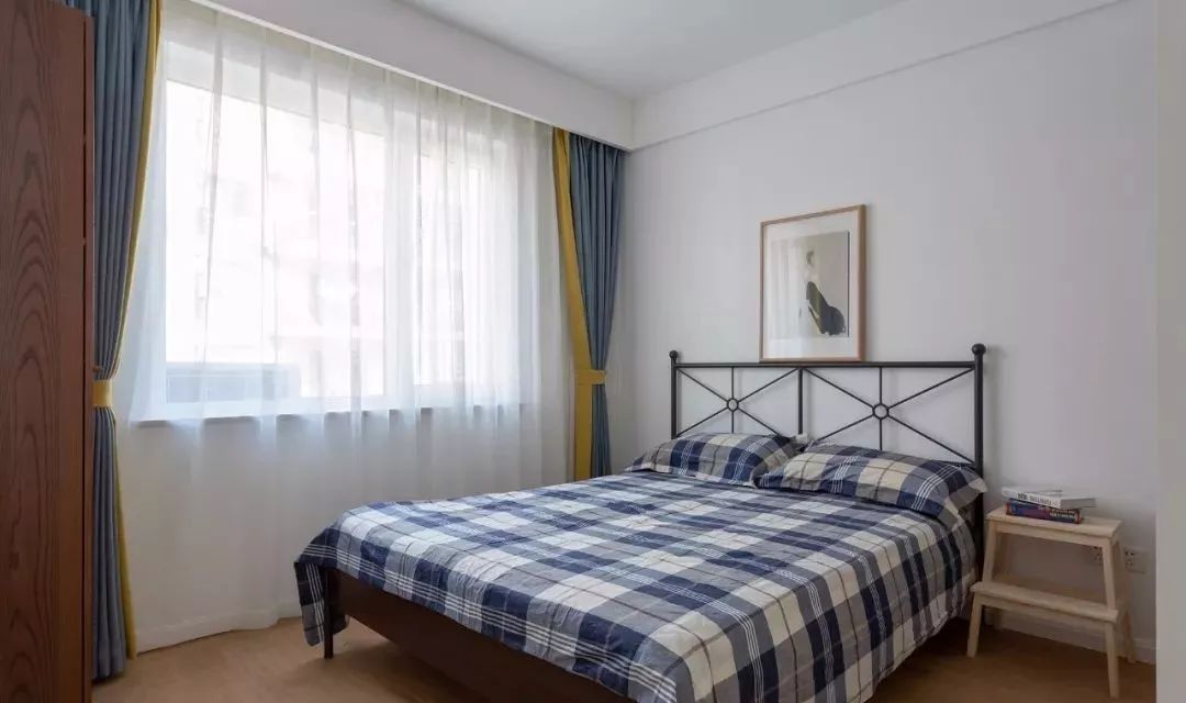 踏脚凳取代床头柜,木纹大衣柜满足空间收纳。
