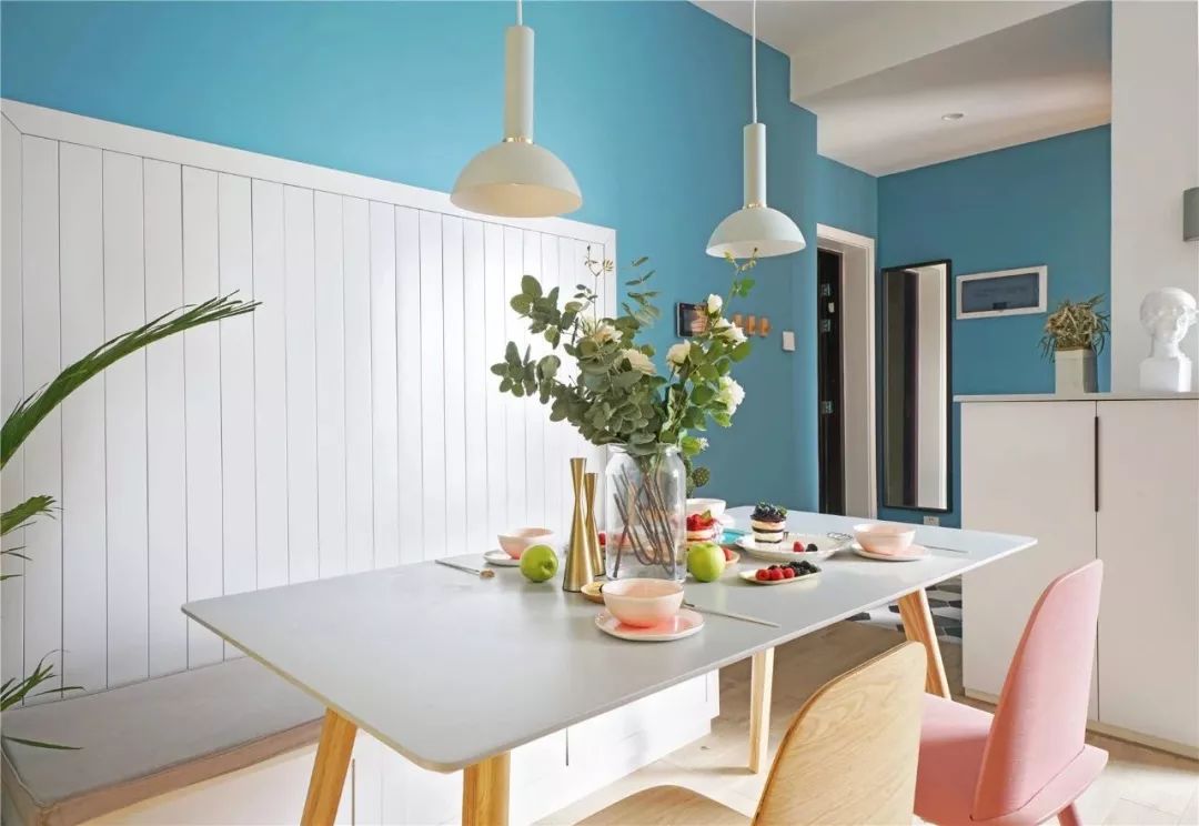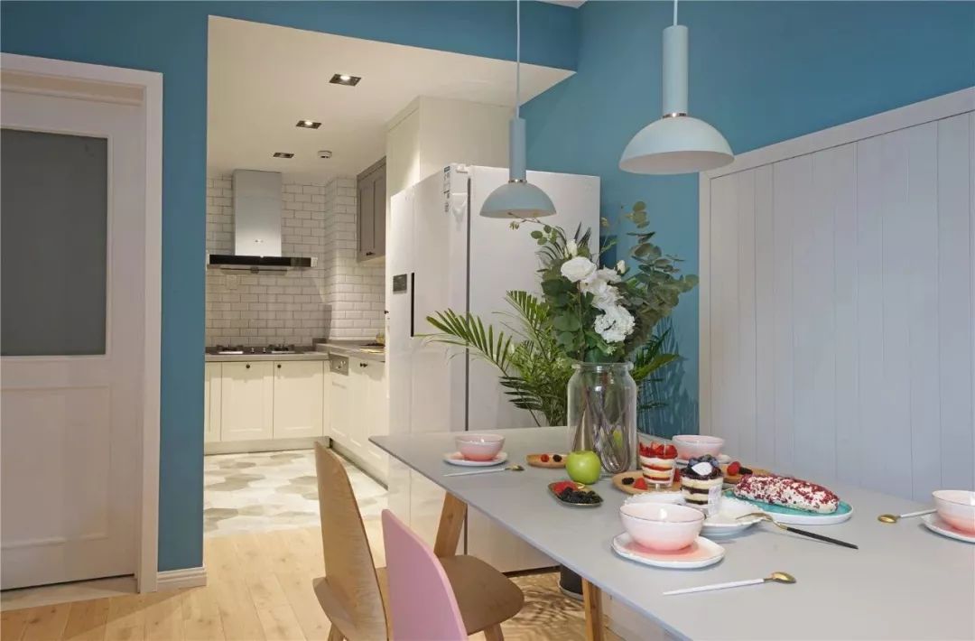 餐厅四周的墙面同样是刷成了蓝色,从玄关一直延伸到了餐厅,让整个空间起到相互呼应的效果,地面铺贴不同的材质也能分隔出不同的空间。