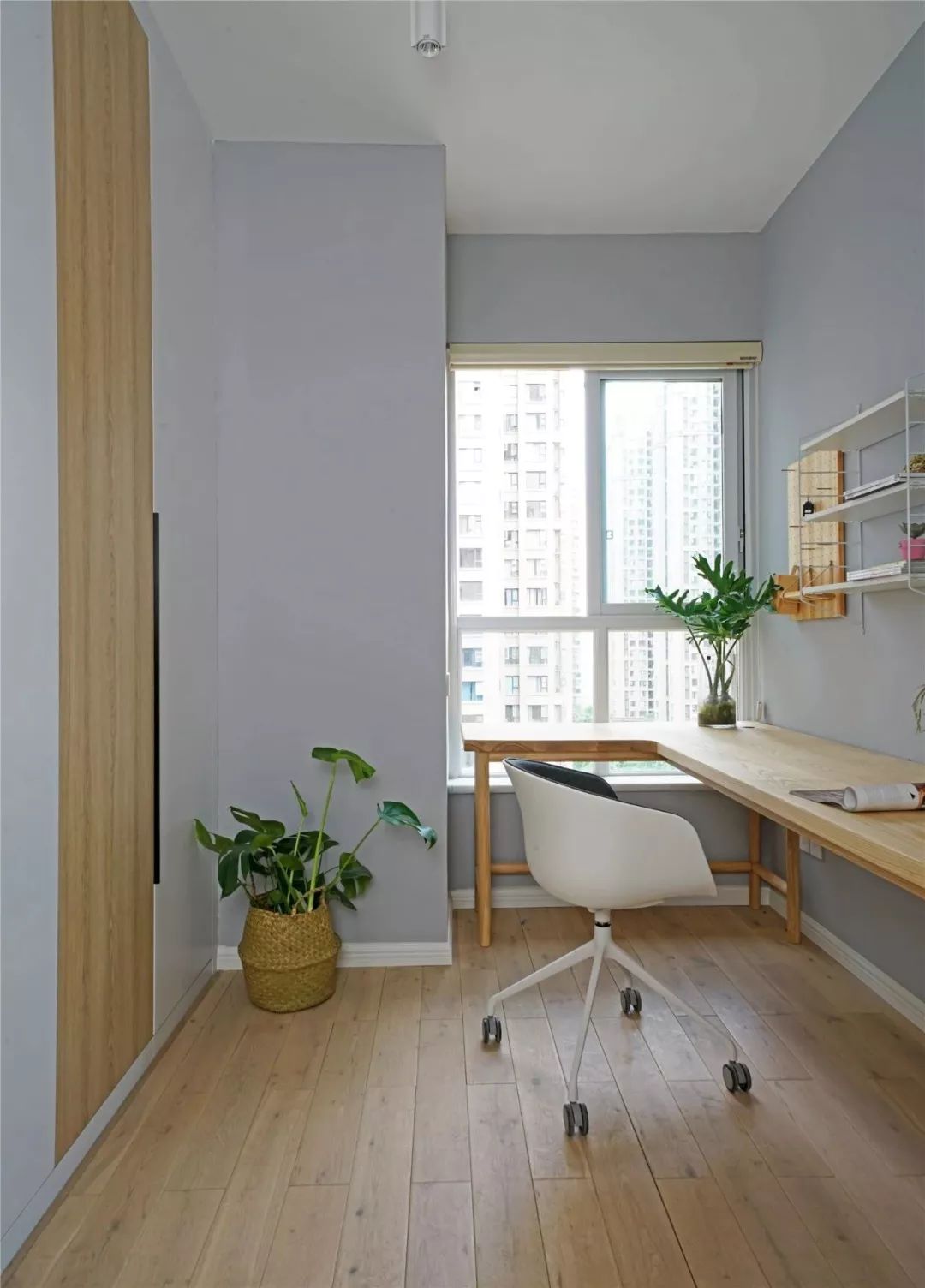 书房的一侧是嵌入式的到顶衣柜,另一侧是L形的转角书桌,墙面用置物架来代替书柜,拿取东西会方便一些,也更有简洁感。