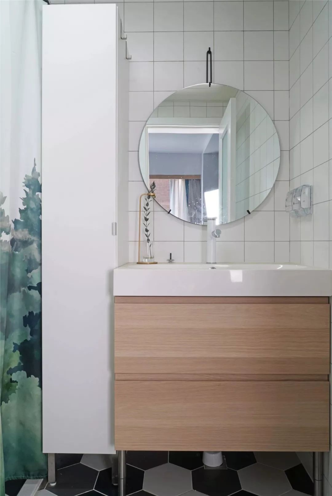 卫生间的墙面铺贴白色的小砖,地面铺贴文艺的六边砖,再加上木质的浴室柜和绿植浴帘,整个卫生间给人一种清新、自然和文艺的感觉。