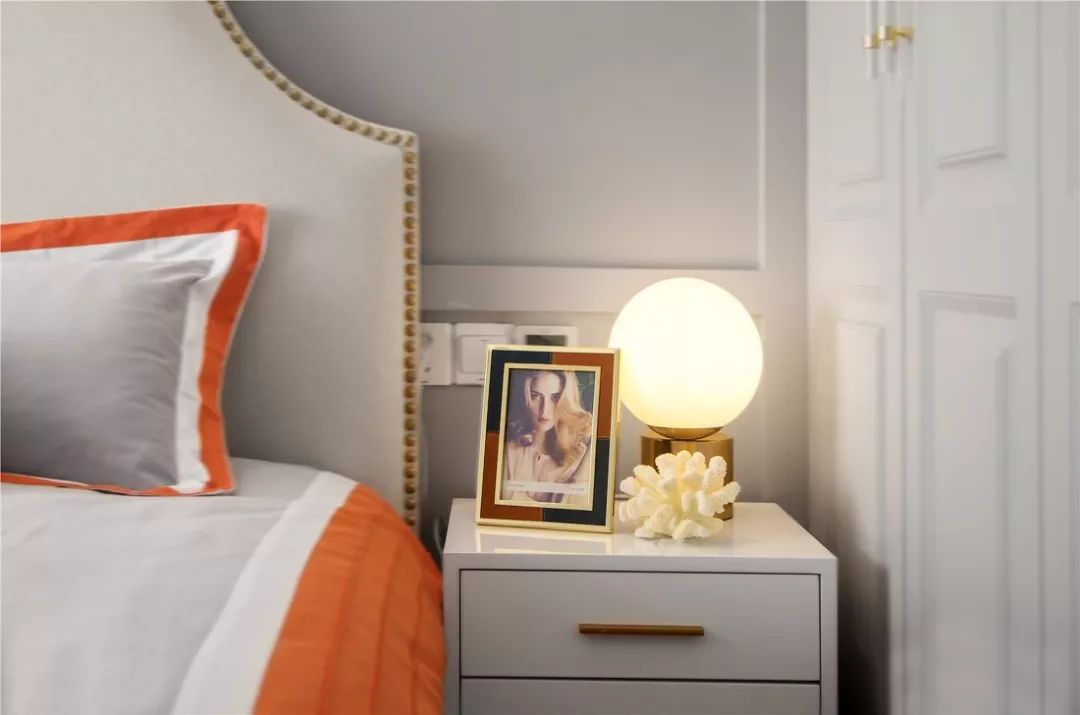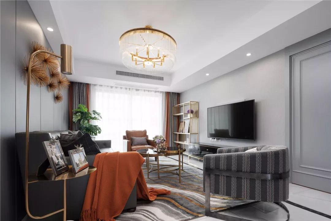 一抹悦动的橙跳脱出整个空间的活力与生机,配合以金色贯穿的家具框架及饰品,释放出轻奢美感。