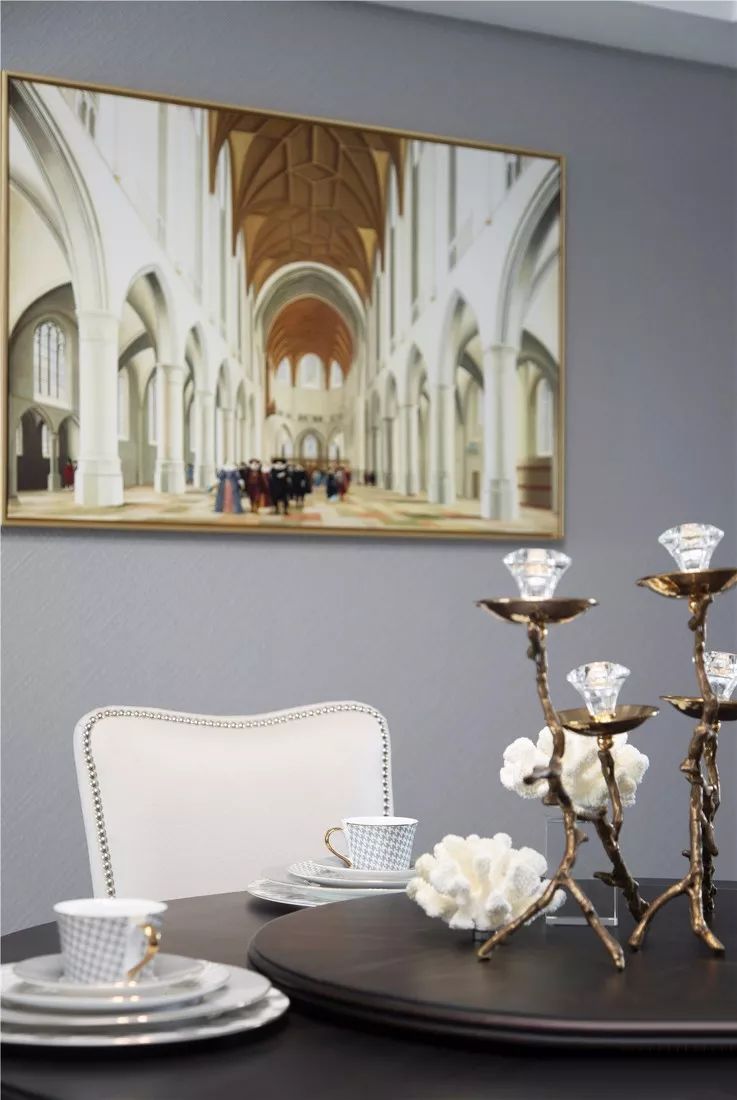 墙面选用了灰色调配上哈勒姆教堂的油画,让用餐空间更为大方得体。