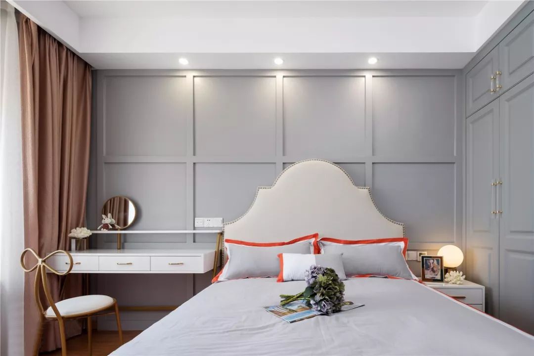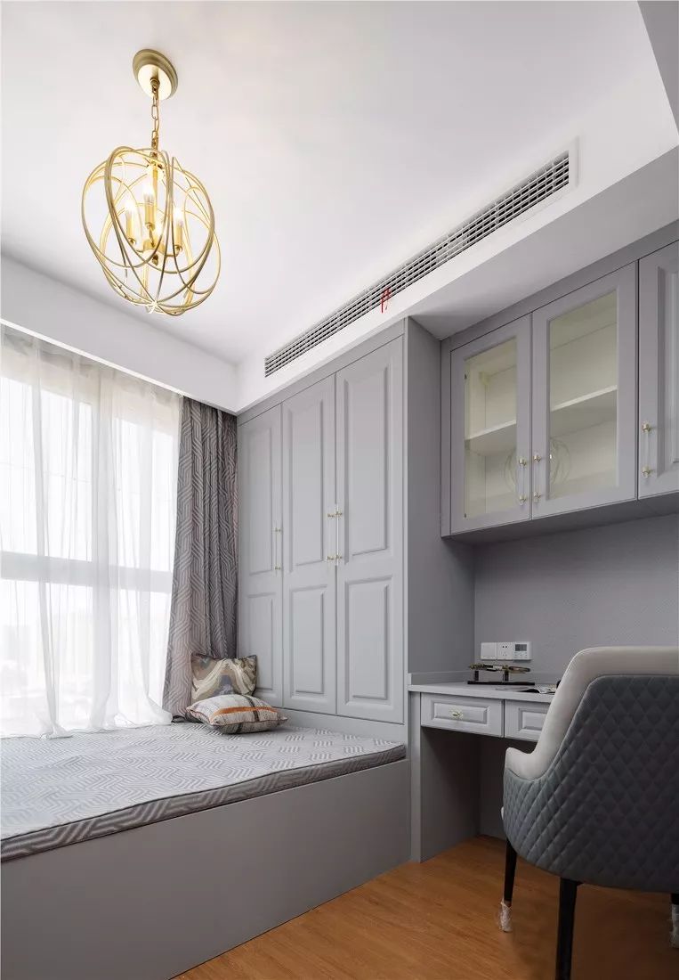 布艺床,精致铆钉外加网红书桌椅,简单而有质感,也增加了家居生活的灵动性。