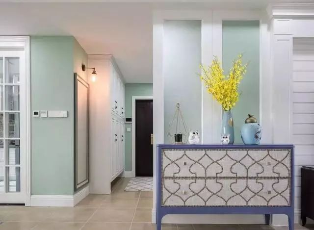 薄荷绿的装饰让人看到的第一眼就觉得特别的清爽又舒适,而且再搭配白色的装饰又多了一份时尚感~而且这个有颜值的玄关其实还是很实用的一个设计,两侧都有收纳设计,一边还含有可以坐着换鞋的座位以及挂钩设计,雨具也可以放置;而另一边也做了一面收纳很强的整体柜,旁边还有一面全身镜呢~
