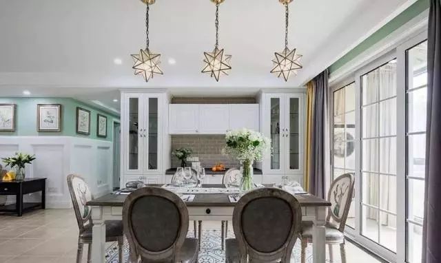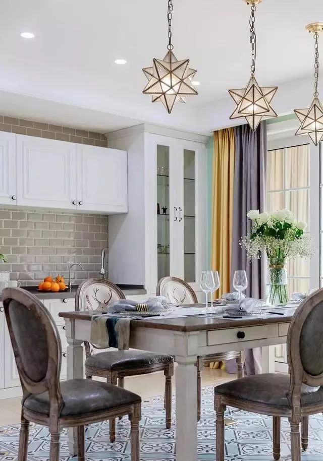 仔细看餐厅的餐桌椅都是很具美式风的,具有古典韵味又有时尚气息,而且餐厅的花色地砖又让这个餐厅的装修更显得别致~