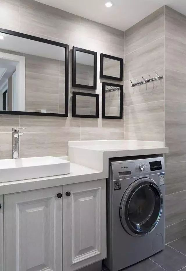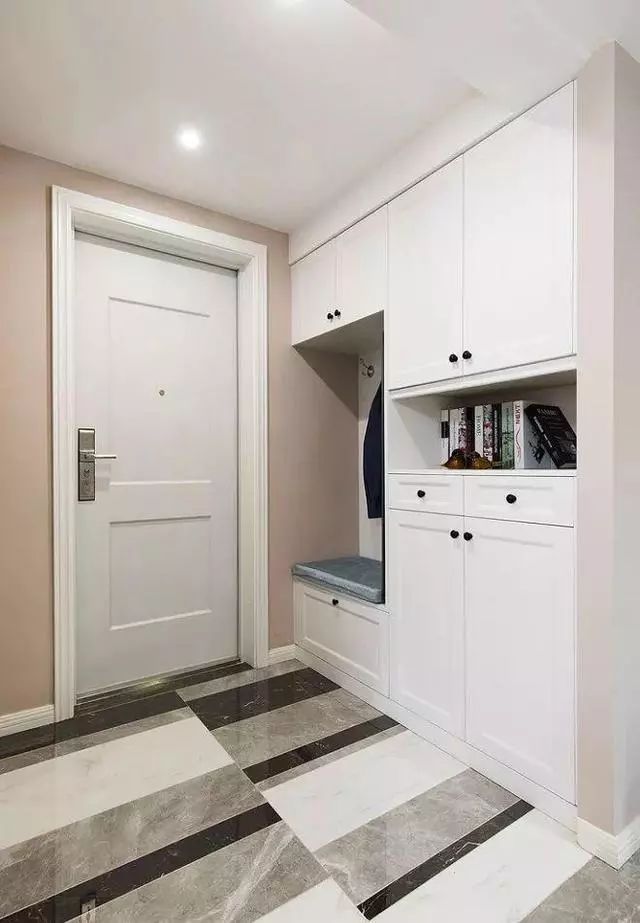 玄关地面用了条纹地砖来铺贴,很有个性,也很有高级感~另外,这个功能齐全的玄关鞋柜也是一个很好的设计~