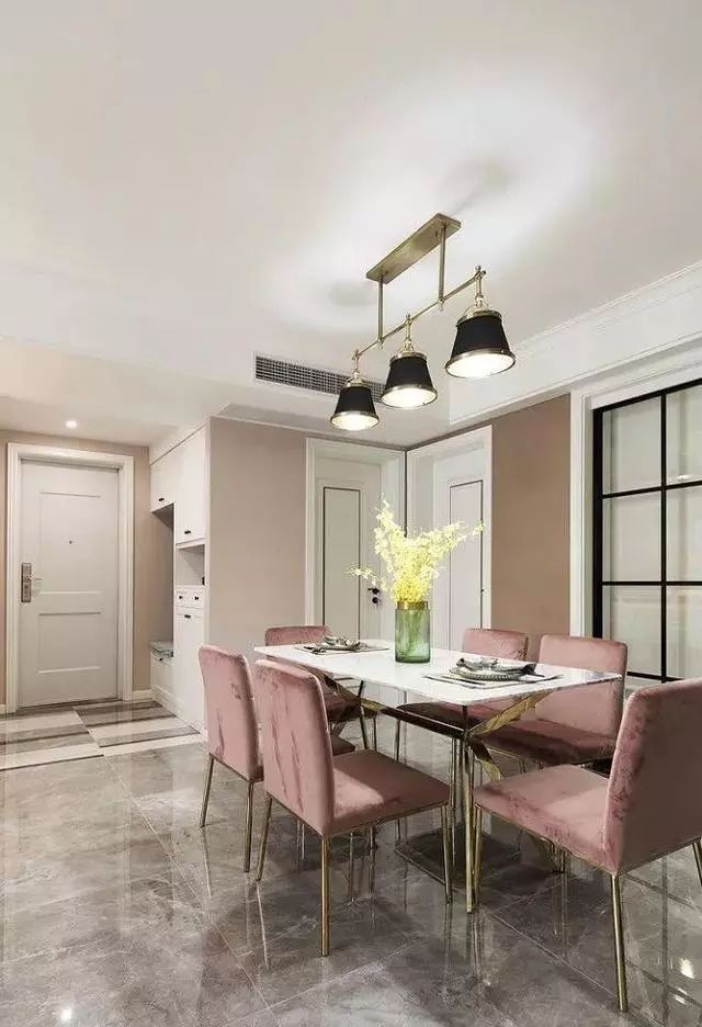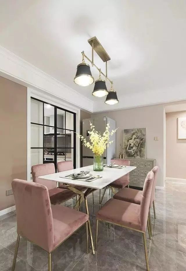 玄关进来就是餐厅了,大理石花纹抛釉砖配上带有金属质感的豆沙色丝绒餐椅以及大理石金属餐桌还有金属质感的吊灯,是不是特显高级感呀~