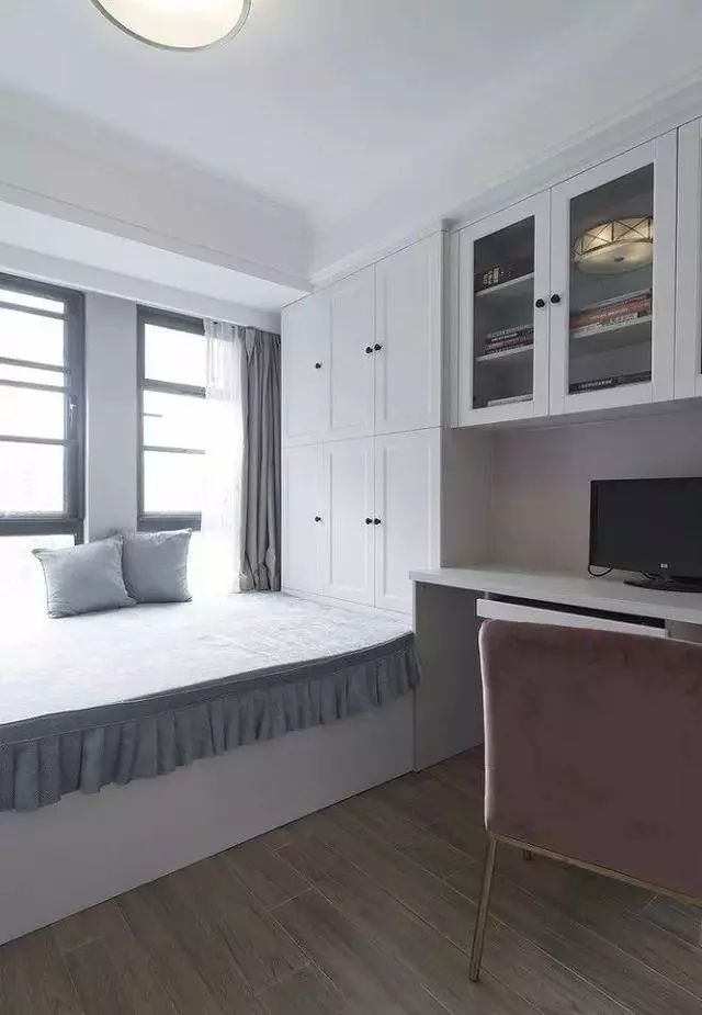 榻榻米与收纳柜、书桌为一体的组合设计,既能当书房也能当客房~