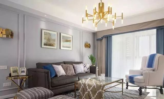 客厅的整体效果是这样的~灰色、金属色、棕色、蓝色混合出一个既柔美又大气的家居客厅~