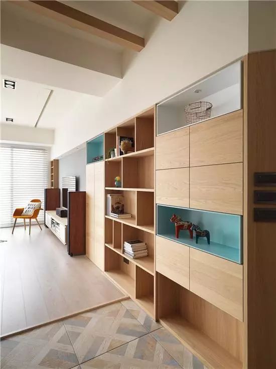 原木墙柜既是收纳空间也是简洁的展示柜,玄关进门直接用彩色地砖做了空间分区,也是方便打扫的落尘区域。
