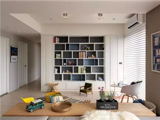拆除原先书房的墙壁,以低矮的木质储物柜重新分割区域,布置小朋友的玩耍空间。每天陪伴着他们一起玩耍也是一种幸福。