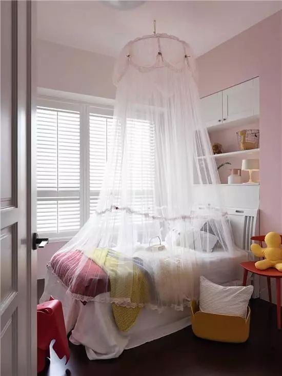小女孩十分喜欢蕾丝的吊顶床帘,睡在床上感觉自己就是小公主。